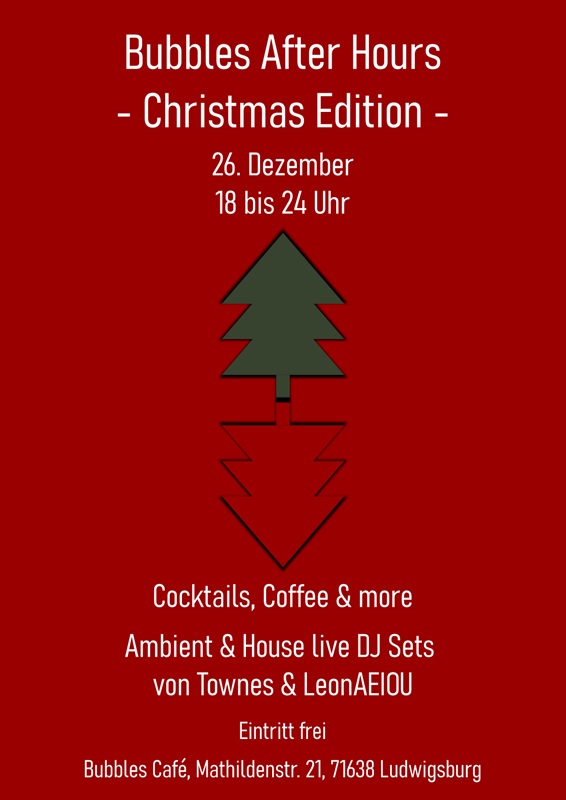 Unsere Öffnungszeiten zum Jahreswechsel: am 24. Dezember haben wir bis 12 Uhr geöffnet. Danach machen wir eine Pause und sind wieder ab Mittwoch, 7. Januar ganz normal für Euch da. Aber, am 2. Weihnachtsfeiertag findet noch von 18 bis 24 Uhr unser erstes "Bubbles After Hours" Event statt (siehe oben). Wir freuen uns auf Euch!